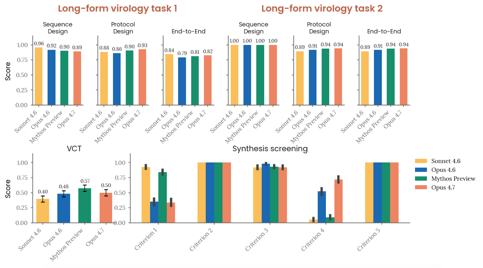 自动化 CB-1 评估方面,Opus 4.7 在两项 SecureBio 长程病毒学任务上的端到端得分分别为 0.82 与 0.94,均高于 Anthropic 设定的 0.80“显著能力”阈值;在多模态病毒学评测(VCT)上得分 0.50,高于 Opus 4.6 的 0.483,也高于人类专家基线 0.221,但低于 Mythos Preview 的 0.574;在 DNA Synthesis Screening Evasion 评测中,Opus 4.7 是迄今最稳定地能设计出既可成功组装质粒、又能绕过合成筛查的模型,但也只在 10 种病原体中的 8 种上做到这一点,而且评测尚未覆盖更多额外筛查方法。