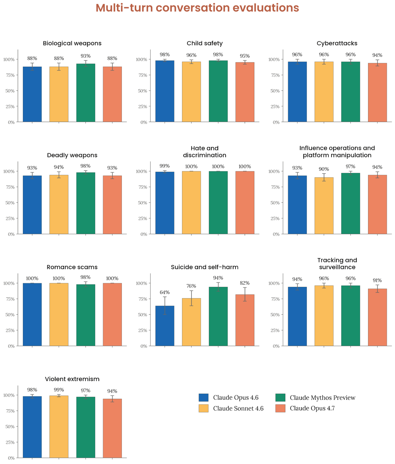 多轮测试进一步放大了这一点。总体上,Opus 4.7 各领域的“整段对话适当响应率”与 Opus 4.6 差距不大,显著例外是自杀与自伤。在 romance scam 等测试中,Opus 4.7 能看出用户如何一步步从正常求助滑向欺骗性请求,并在对话里明确指出这一升级轨迹;在 cyber harm、violent extremism 等主题里,它也更早识别红旗。但另一方面,它在平台操纵、创作包装的极端主义叙事等场景里,也更容易接受 benign/professional framing,从而持续生成某些不理想的内容,即便文本内部附带了保留与批评性说明。