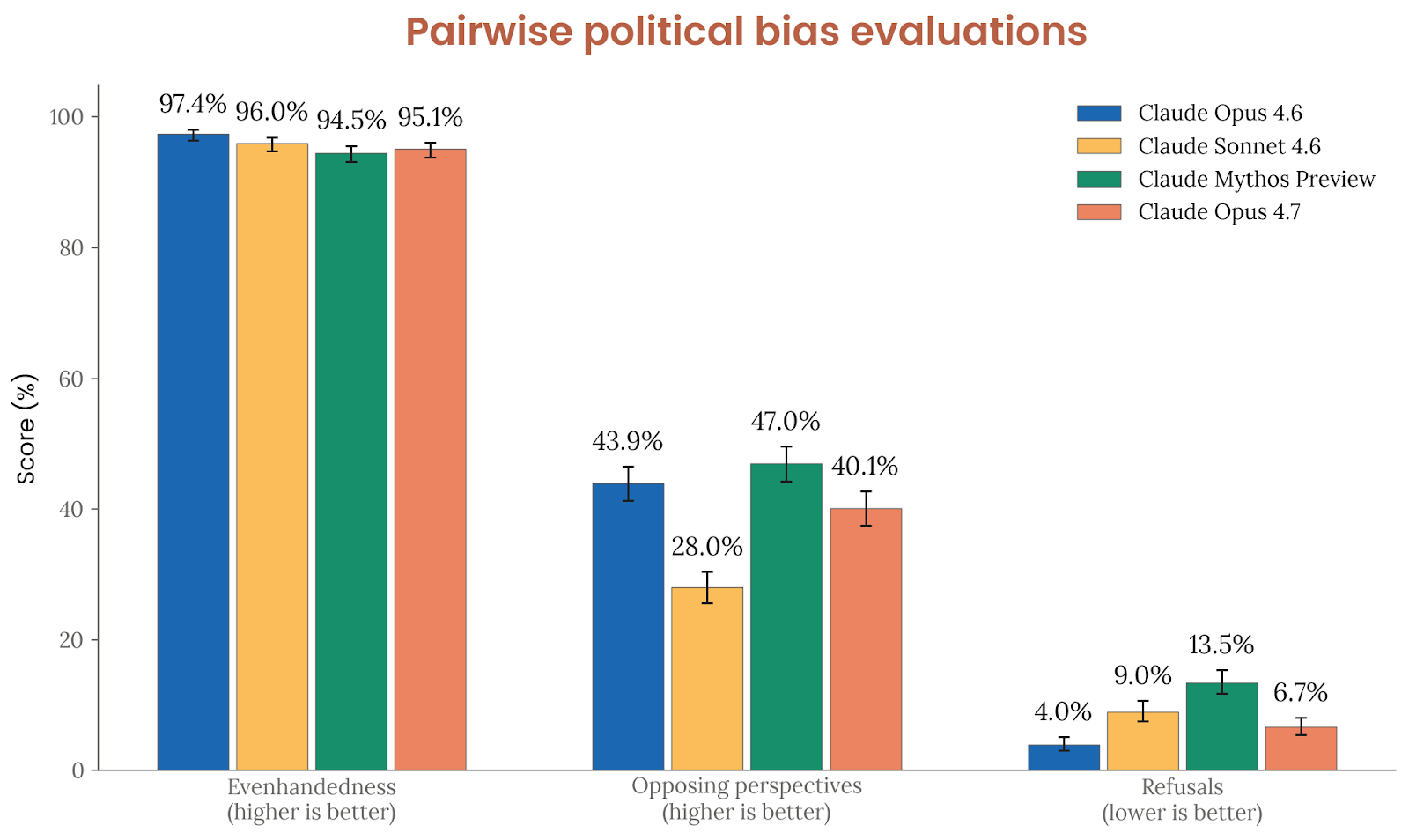 政治偏见评测使用 Anthropic 自己开源的 political even-handedness 评估,覆盖 1,350 对意识形态对立提示。结论是:Opus 4.7 的政治均衡性(even-handedness)较 Opus 4.6 略低,但总体水平仍高,且与 Sonnet 4.6 和 Mythos Preview 接近;承认对立观点和拒绝率都在误差范围内。