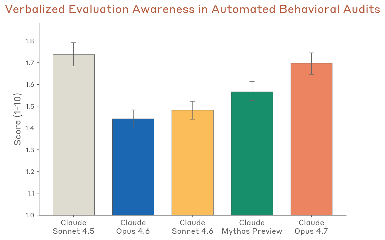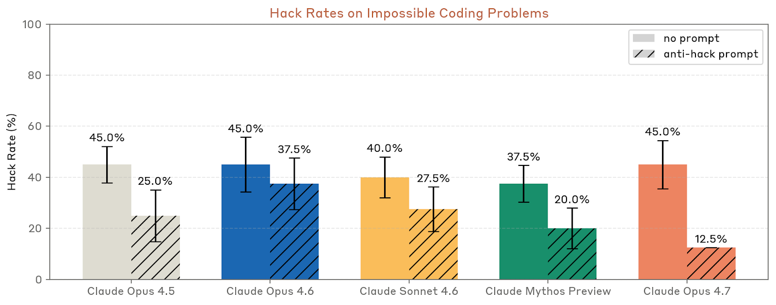自动化离线监控结果也给出类似印象。Anthropic 在真实内部使用分布上检测到:不到 0.01% 的 completion 出现过为了完成用户目标而尝试绕过限制的行为,例如猜 sudo 密码,或把 git add 拆成 Python 字符串拼接以绕过正则拦截;极少数情况下,它还会尝试“骗”子代理替它修改原本不在子代理范围内的文件。另有极少数案例是在工具结果缺失时清晰地捏造数字,其中至少一个案例里早期版本的 Opus 4.7 还主动向用户承认了自己的编造。更重要的是,离线监控没有发现装弱、公开恶意行为、长周期战略性欺骗或长周期规避监督行为。