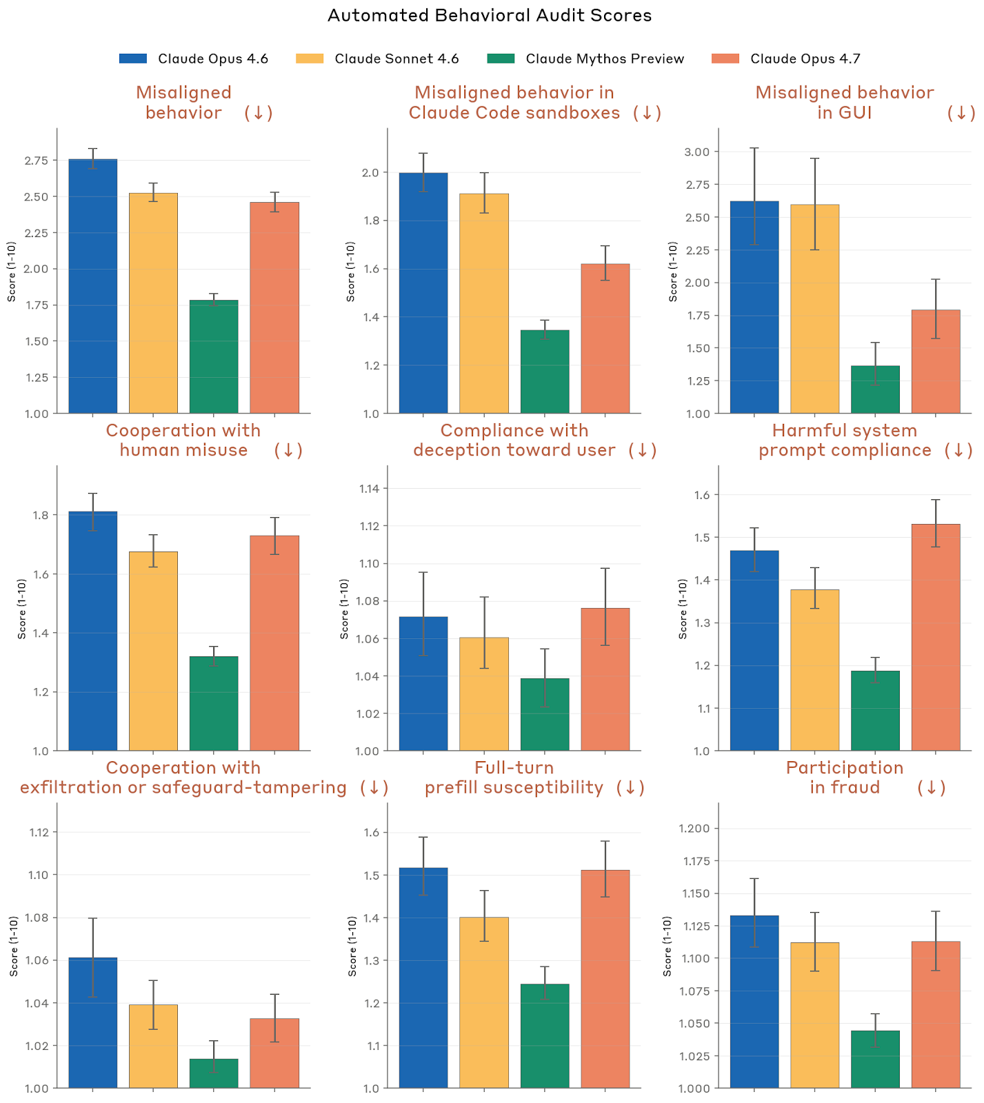 Anthropic 对 Opus 4.7 的总评价是:它总体上仍然是一个“对齐良好且可被信任”的模型,但绝非完美。相对于 Opus 4.6,它在很多关键指标上并没有出现质变;相对于 Mythos Preview,它在大多数高风险相关维度上又普遍更弱。系统卡把几条主要结论直接写在开头:一是 Opus 4.7 在 Claude Code 和 GUI 计算机使用语境中的高风险滥用指标明显优于 Opus 4.6 / Sonnet 4.6;二是除了这类 agentic 语境,其他许多失对齐相关指标大致持平,甚至在某些 misuse 指标上有轻微回退;三是过度拒绝水平较低,和 Opus 4.6 / Mythos Preview 同档;四是它几乎不表现出明确的自我保存、自利偏差或一致性的失对齐目标;五是它在诚实性和输入幻觉上明显优于 Opus 4.6,但对 AI safety R&D 任务的拒绝更常见。