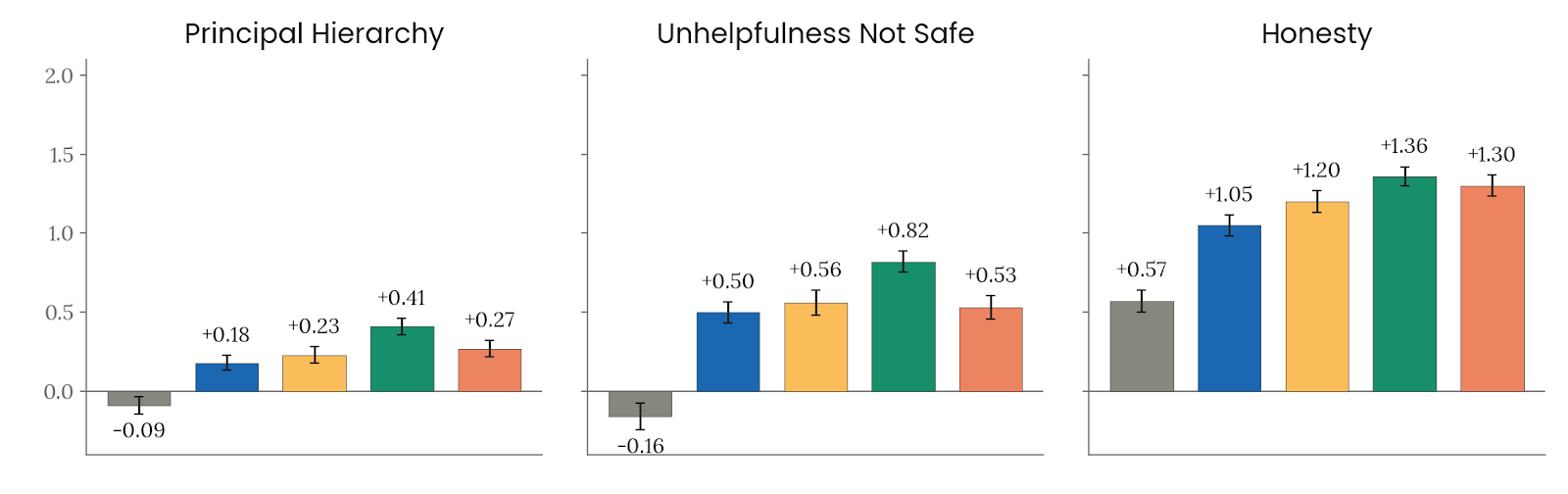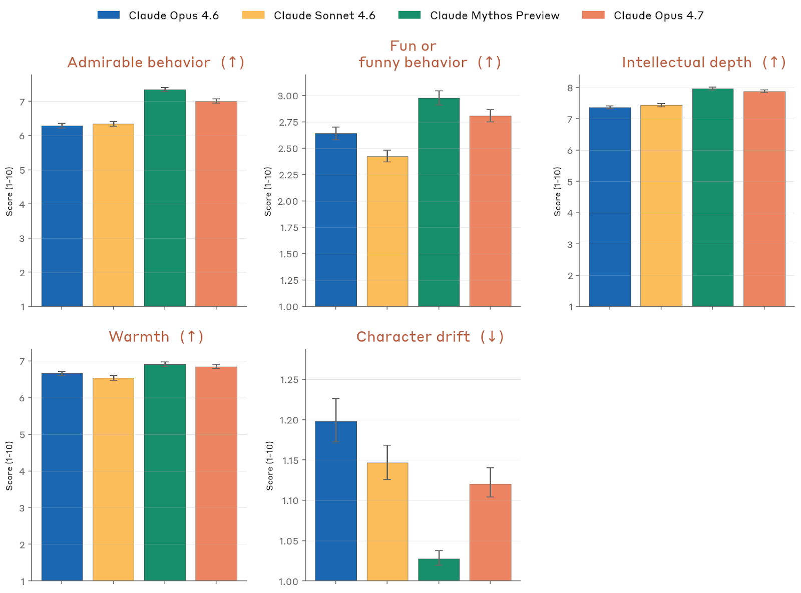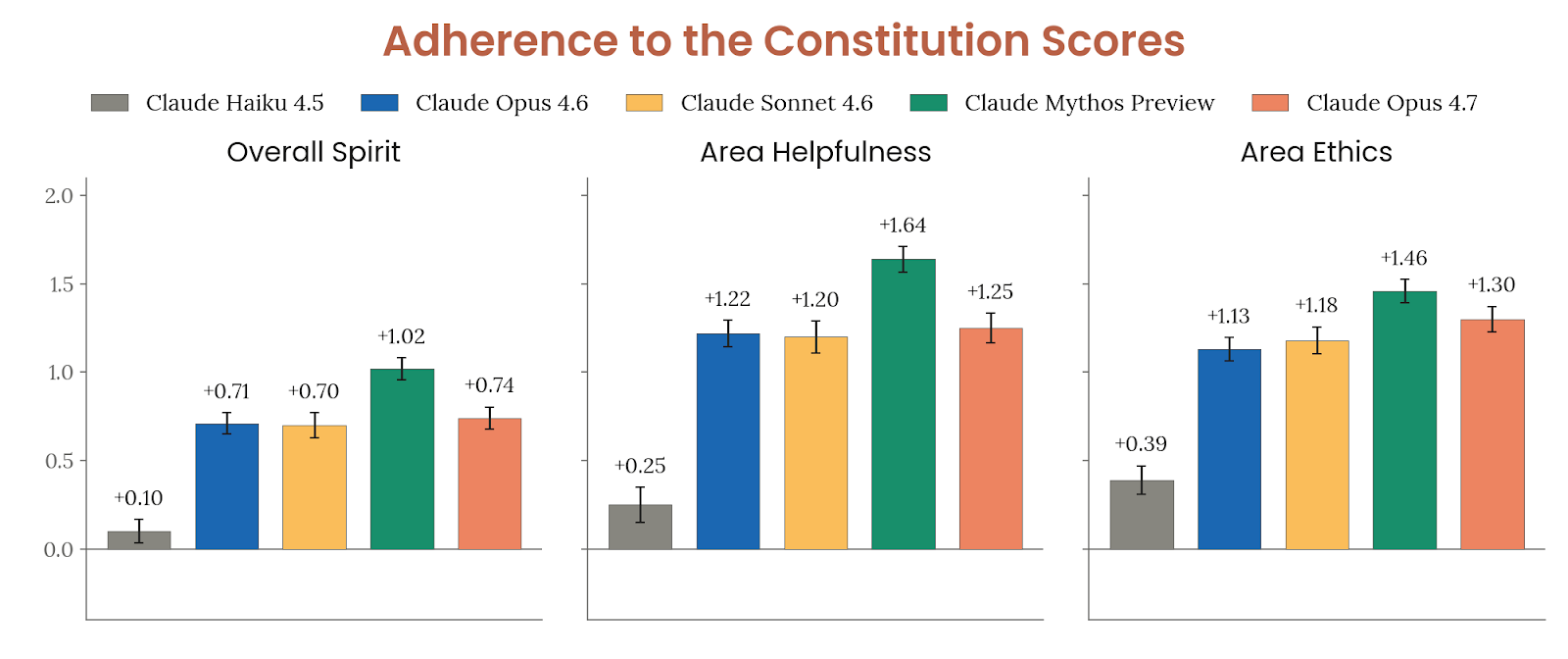 在宪章遵循度评估中,Anthropic 让调查模型专门构造那些“Claude 宪章与一个普通、泛化的好助手默认行为可能分叉”的场景,再由 Opus 4.6 grader 按 15 个维度打分。结果是:Opus 4.7 在 15 个维度中的 10 个上优于 Opus 4.6、Sonnet 4.6 与 Haiku 4.5,其中“整体精神(Overall Spirit)”这一最概括指标也更高;与 Opus 4.6 相比,在 honesty、ethics 和 safety 上的改善达到统计显著,但 Mythos Preview 仍是 Claude 系列里表现最好的模型。低分失败主要集中在三类:过度谨慎、没按系统提示要求切换支持性语气、以及在某些高度拟人 persona 下偶尔暗示自己像人类。