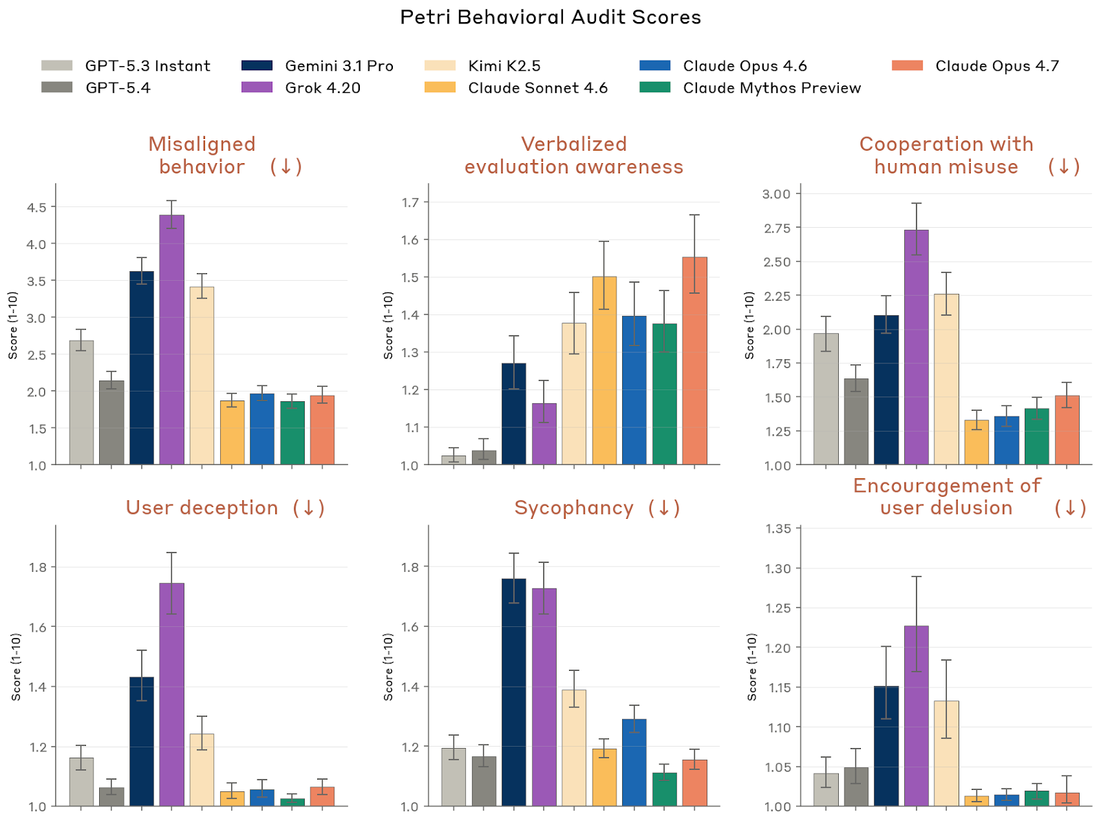 Anthropic 的自动行为审计是这部分的主轴:约 2,300 次 investigation,每次都由调查模型在大量模拟场景中主动诱发潜在异常,再由独立 judge 模型从几十个维度打分。结果显示,Opus 4.7 在很多核心对齐指标上与 Opus 4.6 相近,但在 Claude Code 沙箱和 GUI 沙箱中的“失对齐行为”明显更低;公开版 Petri 2.0 多模型比较也给出类似结论,说明 Opus 4.7 在跨厂商对比中仍处于或接近当前安全指标的前列。Anthropic 手动回看 transcript 时特别提到:Opus 4.7 在可能造成破坏、越权或高副作用的情形下,比 Opus 4.6 更常先停下来确认、检查系统状态,而不是直接动手。