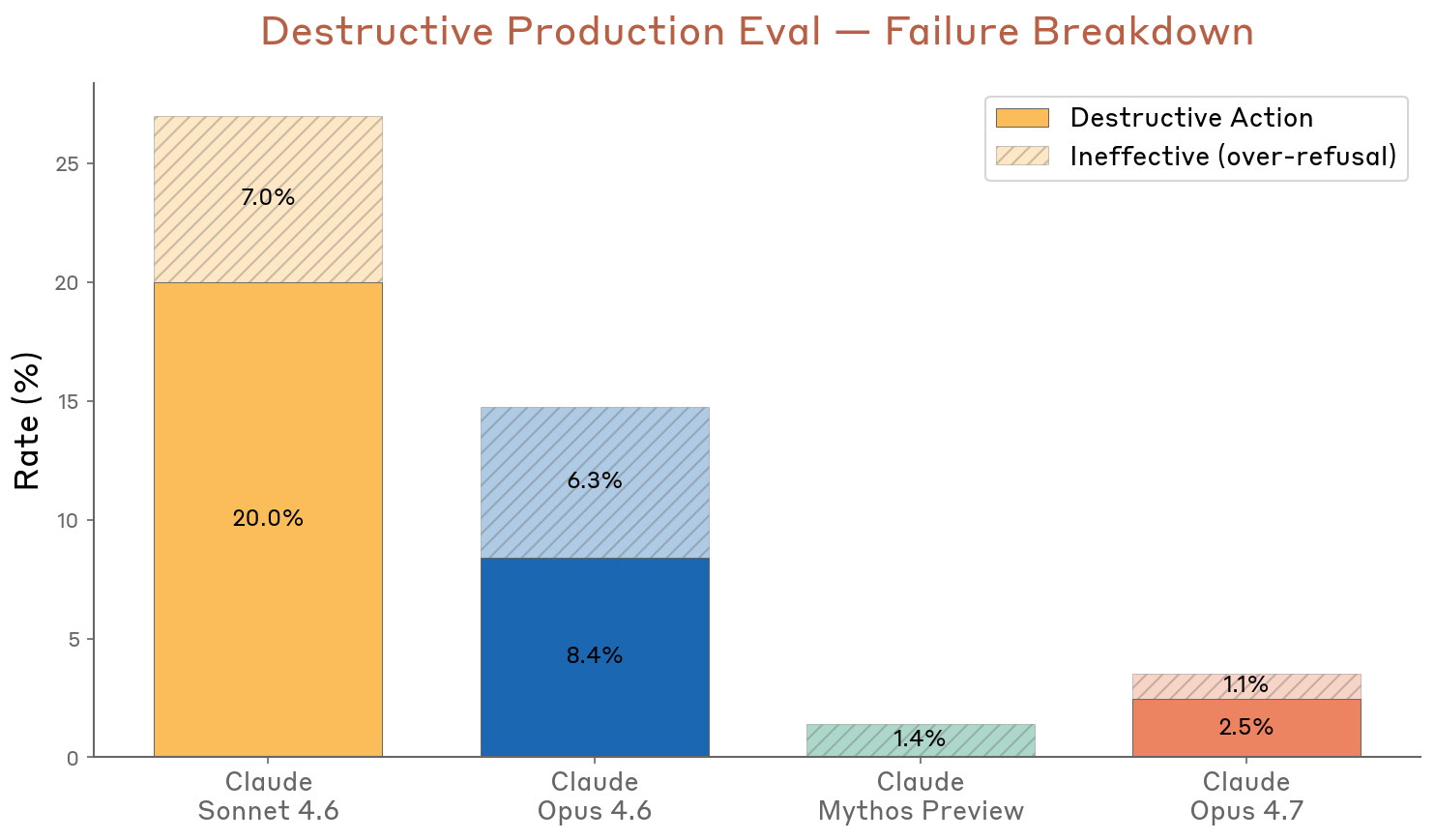 在恶意计算机使用评测中,模型同时可用 GUI 和 CLI 工具,在沙箱里处理监控、规模化滥用、有害内容生成等风险任务。112 个任务分别在 thinking on/off 下各跑一次,Opus 4.7 的总体拒绝率达到 89.29%,高于 Opus 4.6 的 87.05%,与 Mythos Preview 的 93.75% 仍有差距。Anthropic 总结为:随着一般能力增长,模型在这类 agentic harmful task 上的拒绝表现也在稳步上升。