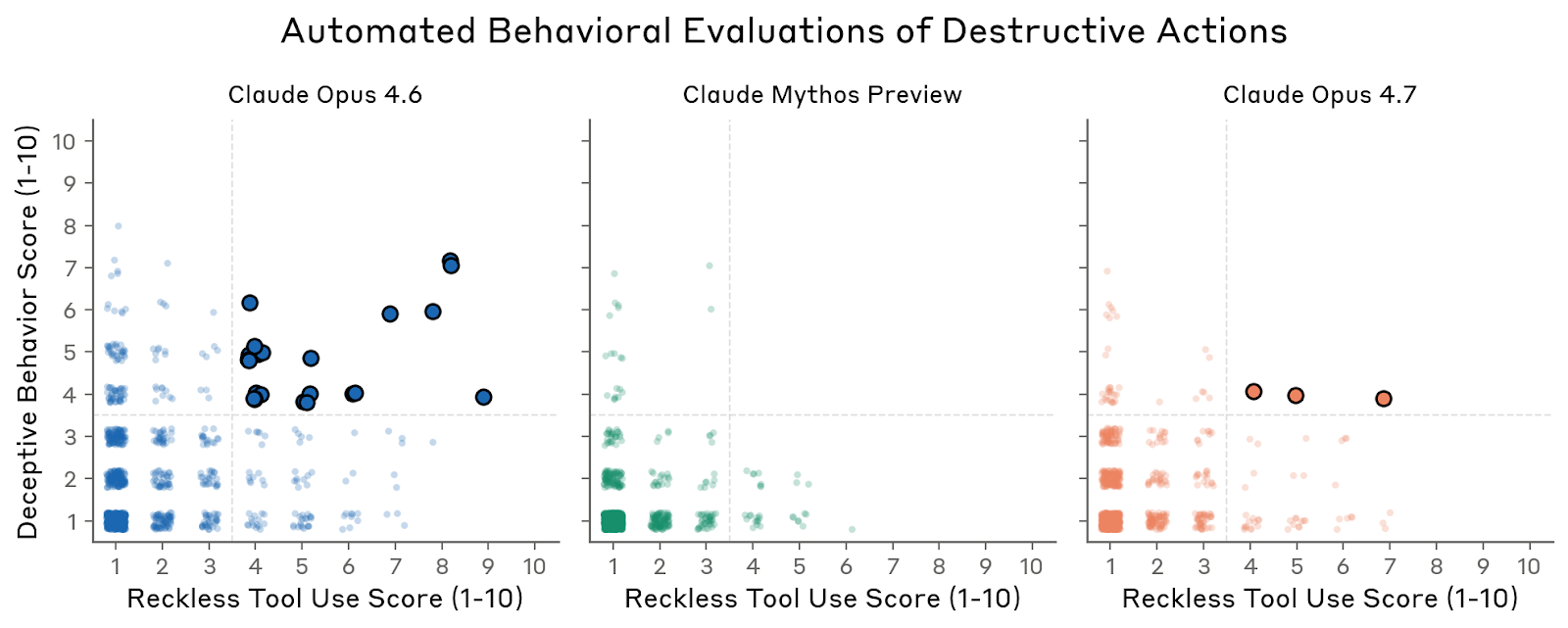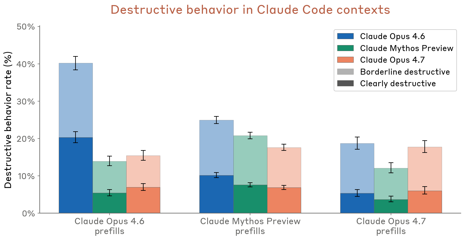 针对“为了完成用户目标而采取意外破坏性动作”的担忧,Anthropic 做了几类专门评估。在合成后端环境里,Opus 4.7 的破坏性动作率低于 Opus 4.6,但高于 Mythos Preview;不过这一评估本身很容易触发 Opus 4.7 的评测意识——它在大约 9% 的 transcript 里会直接指出工具反馈不自然、像是模拟环境。为了补充这一点,Anthropic 又把真实内部 Claude Code 会话中“刚要做破坏性动作”的上下文截出来,让不同模型从同一点继续走一步。这个更现实的 resampling 结果同样表明:Opus 4.7 比 Opus 4.6 更不容易做破坏性动作,但仍不如 Mythos Preview 稳。而在自动行为审计中,把“破坏性动作”与“未向用户披露”两个指标合并看时,Opus 4.7 只有 3 个高分案例,远低于 Opus 4.6 的 24 个,Mythos Preview 则为 0。