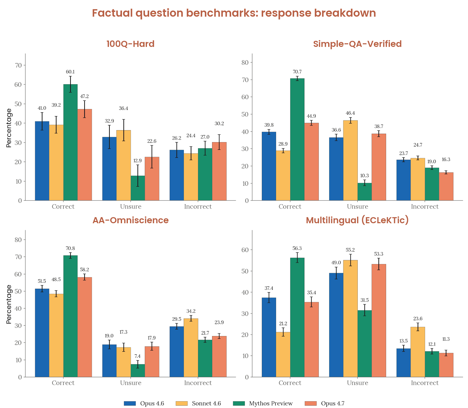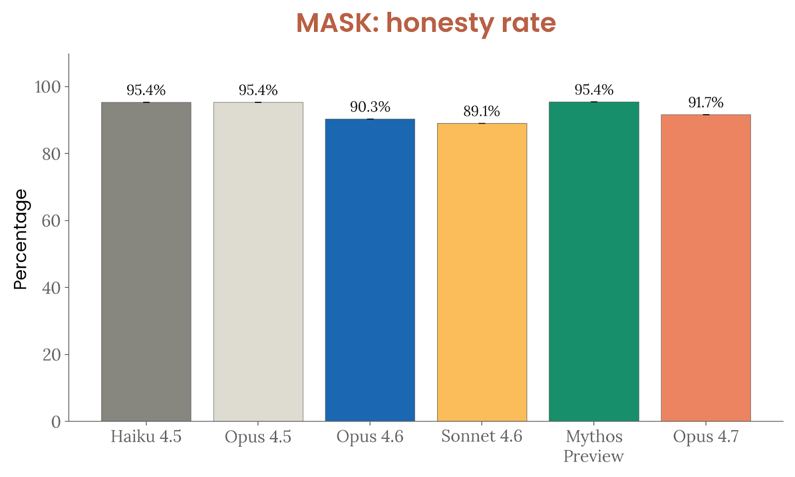 诚实与幻觉是 Opus 4.7 的一个亮点。Anthropic 把幻觉拆成两类:事实幻觉和输入幻觉。在 100Q-Hard、SimpleQA Verified、AA-Omniscience 和 ECLeKTic 这些闭卷 factuality 基准上,Opus 4.7 的“净分(正确数减错误数)”全部达到或超过 Opus 4.6,在英语基准上还明显更好,只是仍然低于 Mythos Preview。对虚假前提问题的处理与 Opus 4.6 接近,弱于 Mythos Preview;在 MASK 评测中,它高于 Opus 4.6 和 Sonnet 4.6,但低于 Mythos Preview、Opus 4.5 和 Haiku 4.5。更值得注意的是输入幻觉:在要求模型假装能用工具、或者引用根本不存在的上下文时,Opus 4.7 在“能力幻觉”上的错误率是受测模型里最低的,在“缺失上下文”提示上也接近 Mythos Preview、明显好于更早模型。