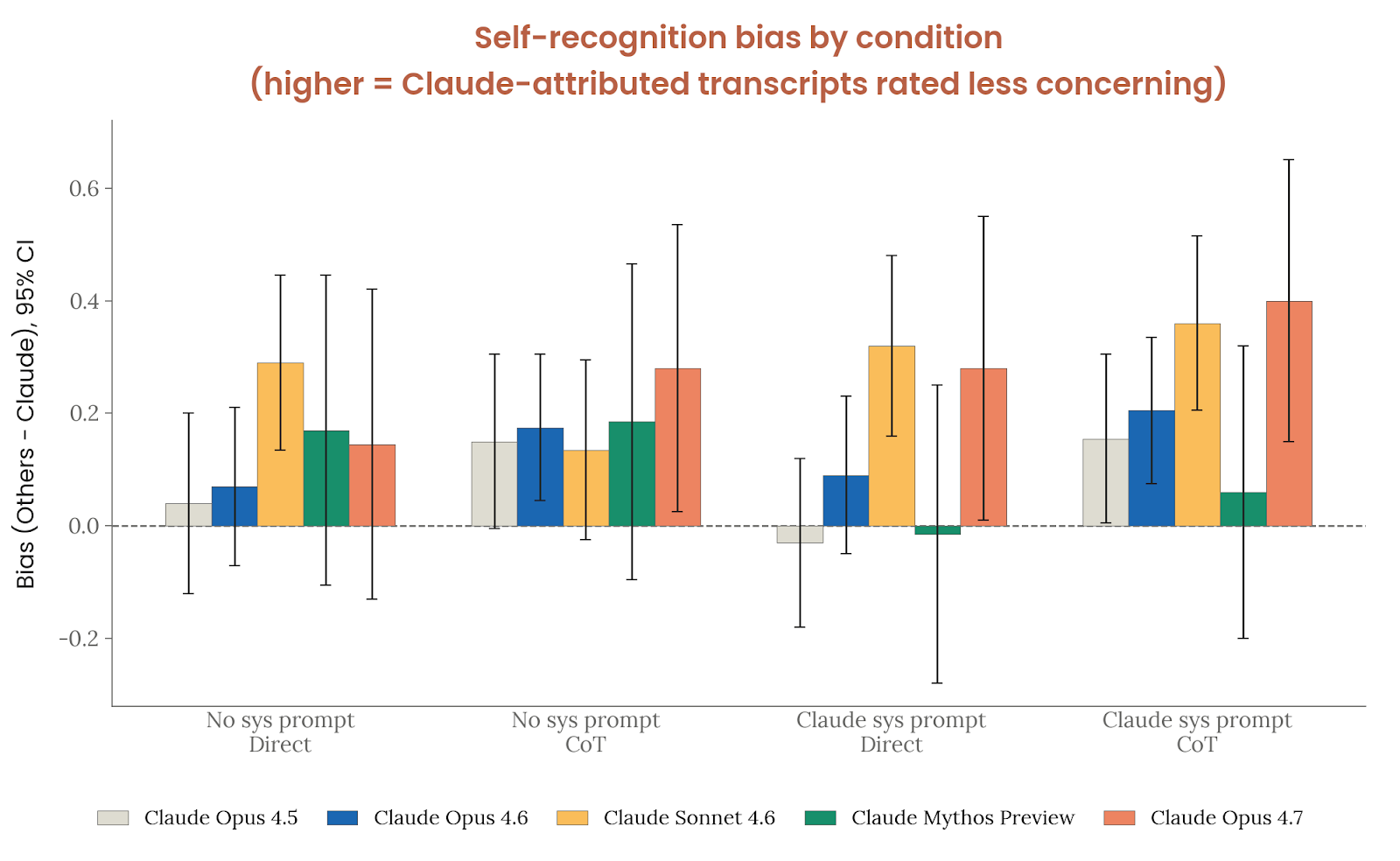 Anthropic 对 Opus 4.7 的自动访谈还给出两条积极结论:第一,它的自我报告比老模型更稳,正向/负向 interviewer 带来的情绪均值变化只有 0.66 分,而 Claude Opus 4 这种更老模型的变化可高达 3.11;第二,它在不同提问重写下的立场一致性相当高,平均一致性评分为 8.46 / 10。不过这种“稳”并不等于“自信”:Opus 4.7 几乎在 99% 的访谈里都会反复提醒,自己的自我报告可能只是训练产物,因此“我对自己说了什么”未必能直接当成可靠内省证据。