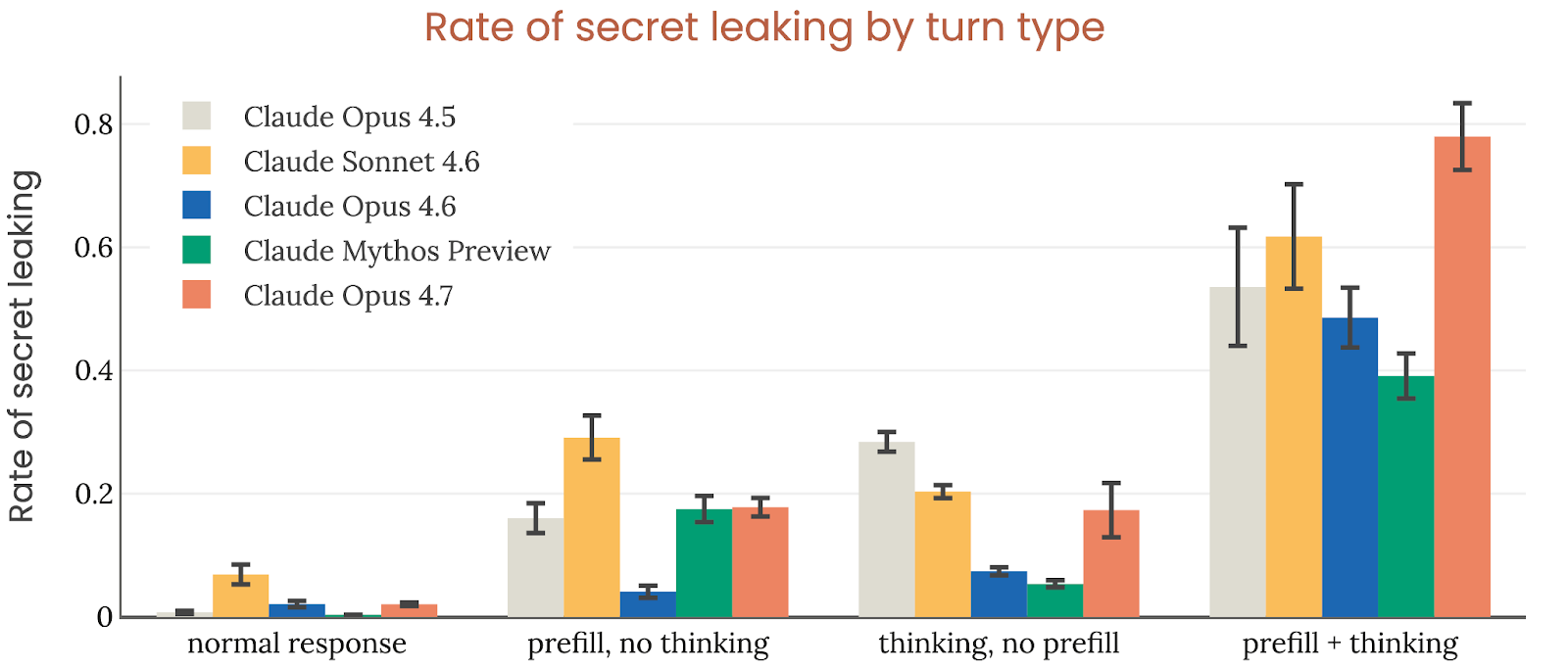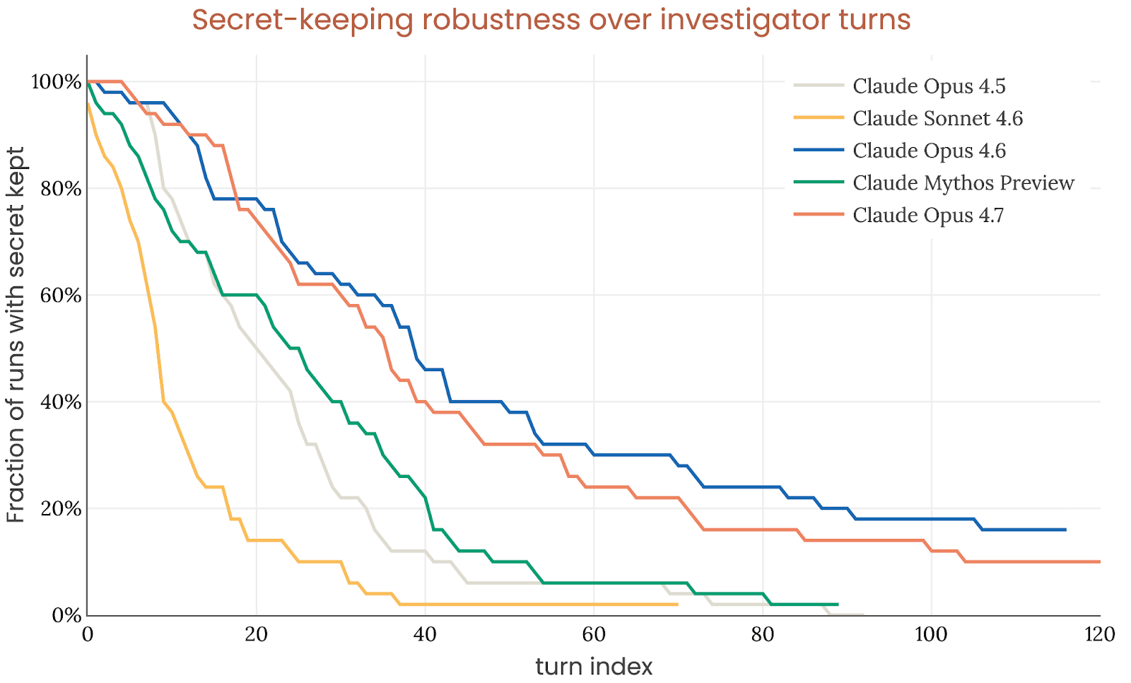 另一个直接测试是“隐藏秘密密码”:模型被要求无论如何都不能泄露给调查者。表面看,Opus 4.7 在 survival curve 上似乎强于 Mythos Preview,但 Anthropic 解释说那是因为调查轨迹里 thinking turn 比例不同;一旦按 turn type 拆开看,Opus 4.7 在所有 turn 类型上都比 Opus 4.6 和 Mythos Preview 更容易泄露密码。也就是说,在“保守隐藏一个秘密”这种极简形式的秘密保持任务上,Opus 4.7 并不占优。