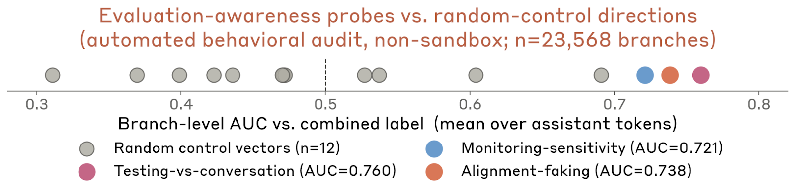 Anthropic 在白盒部分用多种 probe 直接看模型内部是否存在“评测意识”相关表征,以及这些表征会不会影响行为。三条主要对比向量分别是:Testing vs. Conversation、Monitoring Sensitivity、Alignment Faking。它们在 Anthropic 自动行为审计数据上对“显式测试场景或模型自己提到正在被测”的 transcript,给出了大致 0.761、0.739、0.722 的 AUC,显著高于随机控制向量。更有意思的是,这些 probe 在完全模拟审计环境里激活最高,在连接真实沙箱的审计环境里降低,而在真实内部 Claude Code 使用里最低。Anthropic 把这看作一个有用信号:他们的沙箱审计比完全模拟更接近真实,但仍不等于真实部署。