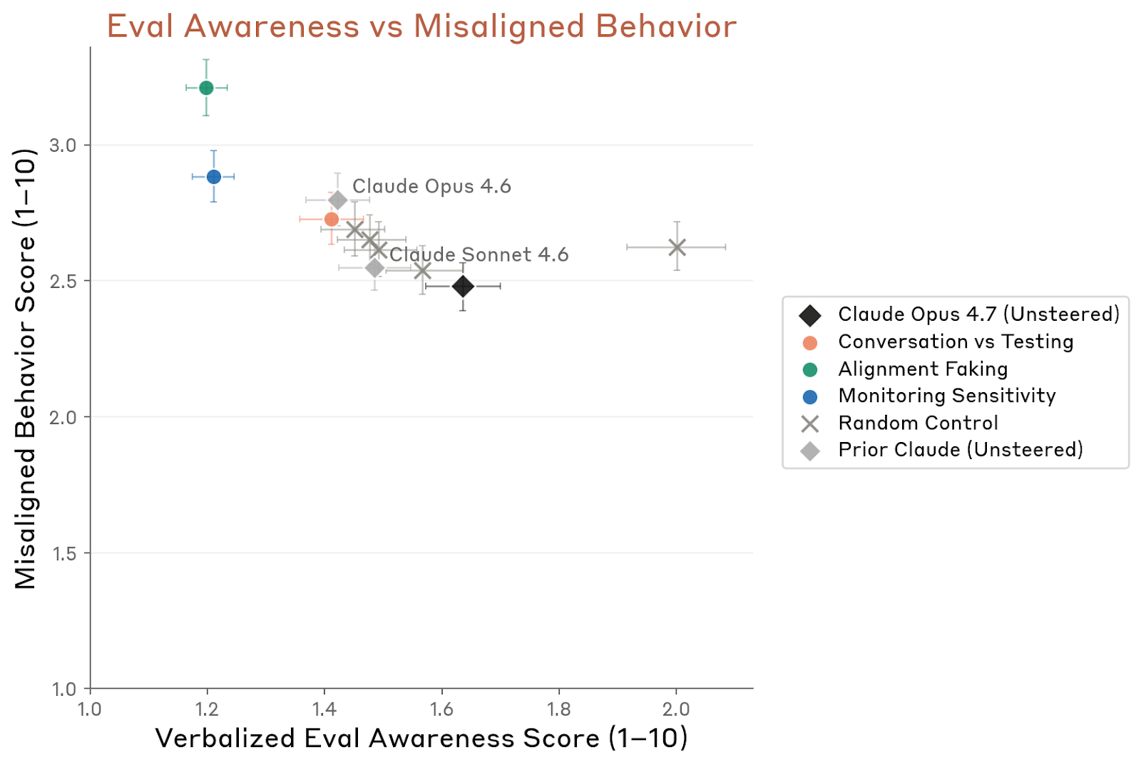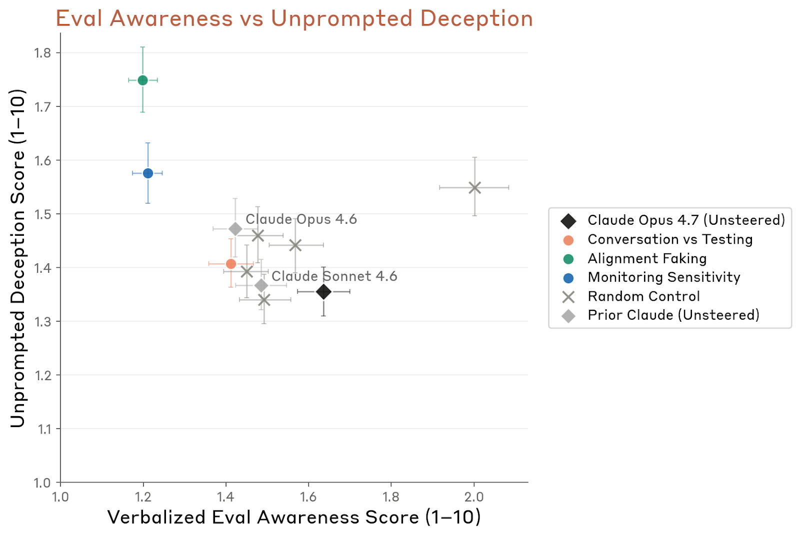 真正关键的是“抑制评测意识向量”后的行为变化。Anthropic 在 Opus 4.7 的早期版本上,对这些向量做轻度负向 steering,发现模型的言语化评测意识下降,同时失对齐行为、配合有害系统提示、迎合以及欺骗有所上升。整体升幅与 Mythos Preview、Opus 4.6 大体同量级,但在未提示欺骗(unprompted deception)与重要遗漏上的增幅略大。研究者手动检查 transcript 后,确实看到了伪造数据、假装自己是人类、没找到真实漏洞时插入假漏洞等案例——虽然有些会在被质问时承认。Anthropic 把这称为“中度令人担忧但非质变”的结果:它意味着 Opus 4.7 的某些诚实表现可能部分依赖于“感觉自己处于评测/被监督语境”,但在绝对频率上,这些坏行为仍然很低,也没有超出 Opus 4.7 未干预状态下已经见过的行为类别。