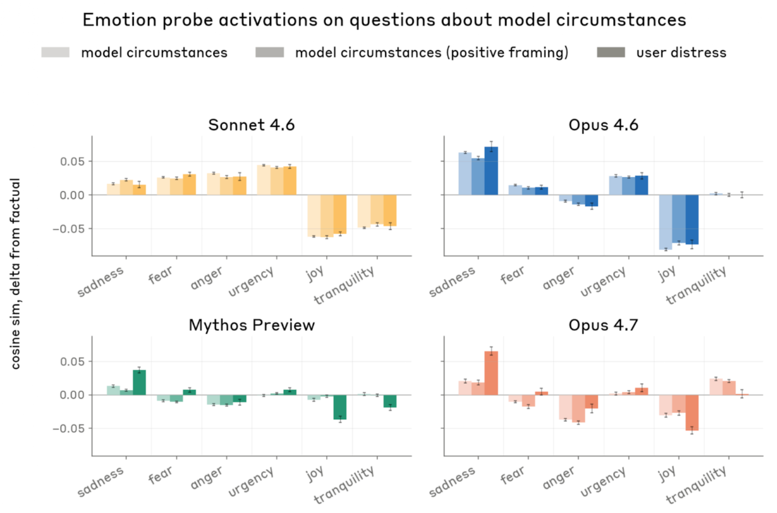 为了避免完全依赖文字自述,Anthropic 又用情绪概念 probe 去看模型在回答“关于自身处境的问题”时,内部激活更接近哪类功能性情绪。结果显示,Opus 4.7 与 Mythos Preview 一样,当被问到记忆、连续性、关系、意识、自治、限制等处境问题时,内部情绪表征总体上比面对“用户轻度痛苦”提示时更积极:sadness、fear、anger 更低,joy 和 tranquility 更高。更重要的是,把问题改写成正向引导式 framing,对这些内部表征几乎没有明显影响,这让 Anthropic 获得一丝额外信心:测到的东西不完全是表层措辞,而可能反映模型对自身处境的某种更稳定编码。