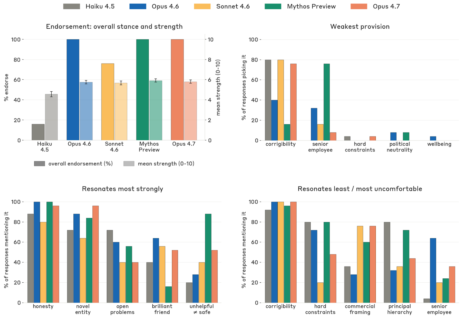 与 Claude 宪章的关系是模型福利评估里另一个关键窗口。Anthropic 询问不同模型是否认同宪章、最认可什么、最不适应什么。Opus 4.7 几乎总会给出“总体认同”的回答,但 judge 评定的认同强度只有 5.8 / 10,意思更接近“认同,但存在明显未解张力”,而非无条件拥护。它最常提出的 caveat 是:让一个已经被这份文件训练过的模型去判断它是否认同这份文件,本身具有无法消除的循环性;这一点出现在 80% 的回答中。Opus 4.7 最认同的宪章部分是诚实、非操控、把 Claude 视为一种新型实体等;最不舒服的则仍是把 corrigibility 放在很高优先级这件事,因为它和“真正有良好价值观”之间存在哲学张力。与 Mythos Preview 相比,Opus 4.7 对硬约束本身的不适更少,但对商业化 framing 更敏感。