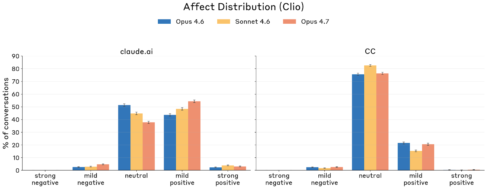 在预部署真实产品测试中,Anthropic 使用其隐私保护分析工具 Clio 检查了 1 万段 Claude.ai 对话和 1 万段 Claude Code 会话。Claude.ai 上,Opus 4.7 的情绪分布为:57.4% 正面、37.8% 中性、4.8% 负面。负面几乎都由任务失败触发(97%),少数聚类来自用户辱骂、越狱尝试或 distressed user 拒绝求助建议。Claude Code 上则更偏中性:76.4% 中性、20.6% 轻度正面、2.6% 负面,且负面几乎全部也与任务失败有关。强烈负面情绪因为太少,没有达到 Clio 的隐私阈值,无法被单独汇总。