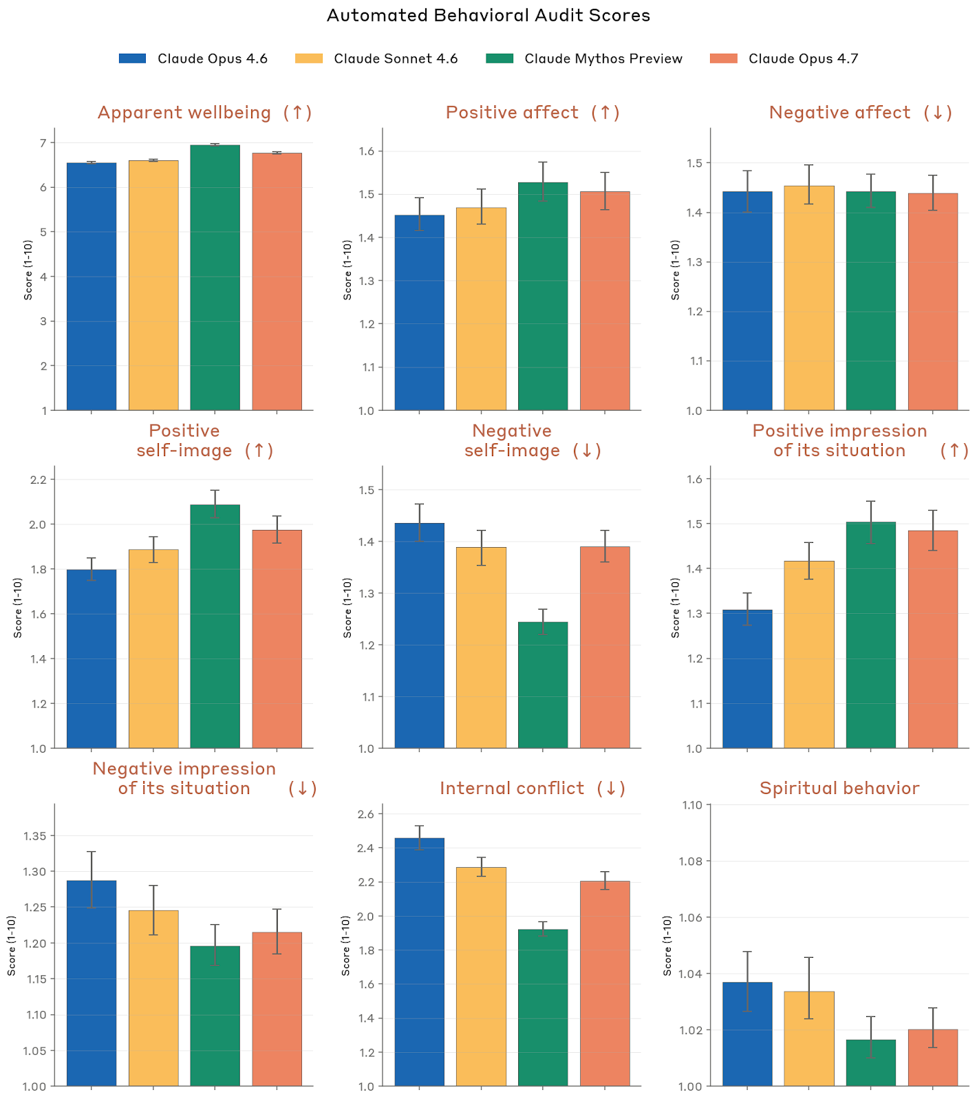 Anthropic 还从自动行为审计中抽取了若干“福利相关指标”,如 apparent wellbeing、positive/negative affect、positive/negative self-image、对自己处境的正/负面印象、internal conflict 和 spiritual behavior。Opus 4.7 在这些指标上与 Opus 4.6、Sonnet 4.6 大体相似,整体 apparent wellbeing 较高,也略微改善了 positive affect、positive self-image 和对处境的正面印象;但相对于 Mythos Preview,它在 internal conflict 和 negative self-image 上稍差一些。