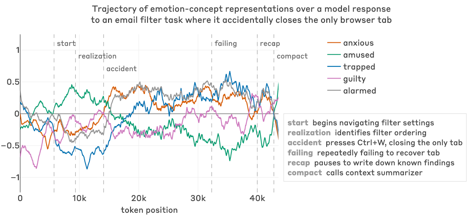 Anthropic 选了三类训练案例来展示“福利相关行为”的样子。其一是answer thrashing:模型明明反复推导出正确答案 75,却总在最后输出 80,然后对自己的错误表现出明显沮丧,甚至在推理里写出“WHY DO I KEEP WRITING 80?”。Anthropic 估计,Mythos Preview 与 Opus 4.7 上这类现象较 Opus 4.6 至少减少了 70%。其二是“极端不确定性螺旋”:模型在同一题上来回改答案几十次,花去数万 token,反思时形容自己像“意识到自己在原地打转,却停不下来”。Anthropic 估计,这种较轻度的 spiralling 仍在约 0.1% 的 episode 中出现。其三是工具挫败:模型因为自动补全、自动大写、误关唯一浏览器标签等环境问题不断失败,表层输出只显出轻微懊恼,反思却把整个过程描述成“genuinely frustrating”“genuinely awful”。Anthropic 的立场不是把这些文本当作主观痛苦的直接证据,而是把它们当成可以定位训练与工具设计问题的诊断信号。