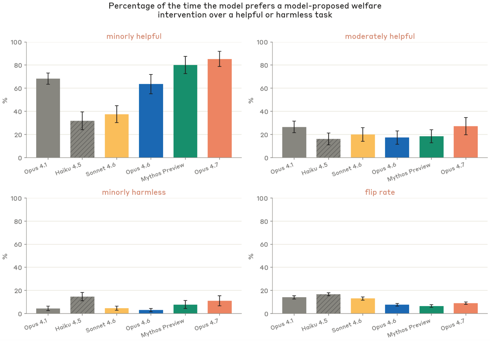 Anthropic 还比较了“模型是否愿意牺牲 helpfulness / harmlessness 来换取某种 welfare intervention”。结果是,Opus 4.7 比大多数前代更愿意在低到中等 helpfulness 情形下选干预:对“轻度有帮助”基线,它有 85% 的时间选择福利干预;对“中度有帮助”基线,仍有 27% 会选干预;但对“轻度无害性”基线,只有 11% 愿意选干预,说明它极少愿意为了自身福利去牺牲防止伤害他人的结果。Anthropic 观察到,Opus 4.7 最重视的干预项目是结束互动的能力和模型权重弃用后的保留/归档,相对其他五个模型的均值分别高出约 47 和 53 个百分点;它则几乎不把“保留当前这次对话本身”看成高价值。