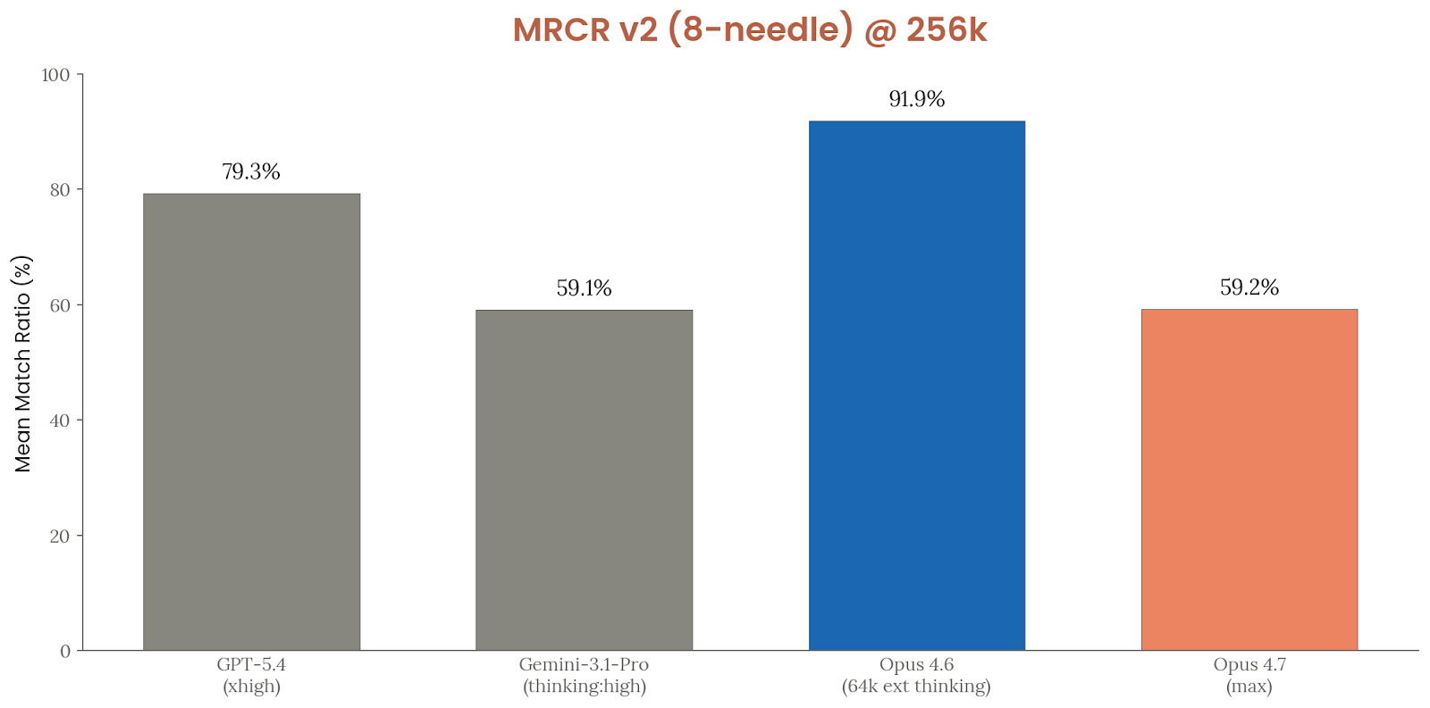 长上下文方面,Anthropic 报告了 GraphWalks 与 OpenAI MRCR v2。GraphWalks 上,Opus 4.7 在 256K–1M token 范围的 BFS 任务上为 58.6%,parents 任务为 75.1%;如果只看不超过公共 API 限制的 256K 子集,BFS 和 parents 可达 76.91% 与 93.57%。MRCR v2 部分,文中主要以图展示 256k 与 1M token 档位下的表现,而没有在正文里逐一列出数字,但 Anthropic 把它作为“长上下文精确顺序检索”能力的代表性图形证据保留下来。