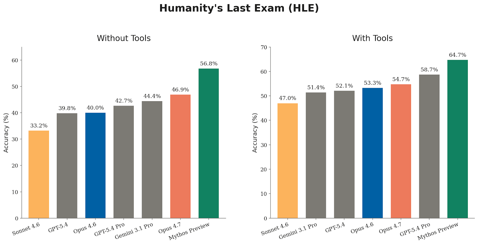 Humanity’s Last Exam(HLE) 是 Anthropic 最重视的综合前沿知识基准之一。Opus 4.7 在无工具配置下得分 46.9%,有 web search、web fetch、程序化工具调用和代码执行时得分 54.7%。为了避免 tool use 版本结果被题库泄漏污染,Anthropic 一方面对搜索器和 fetcher 加入 blocklist,另一方面再让 Opus 4.6 审阅 transcript,把确实来自 HLE 特定来源的答案判为错误;附录对这一 blocklist 机制和模式列表做了补充说明。