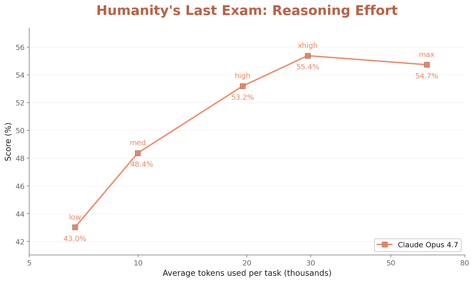 在 ARC-AGI 上,Opus 4.7 呈现出非常细的 pattern:ARC-AGI-1 在 High effort 下约为 93.5%,与 Opus 4.6 的 94.0% 基本持平,而且两者都在 High effort 时高于 Max effort,Anthropic 认为这可能是超高思考预算下 context exhaustion 的副作用;ARC-AGI-2 则达到 75.83%,成为 Opus 系列在该 benchmark 上的新高分。