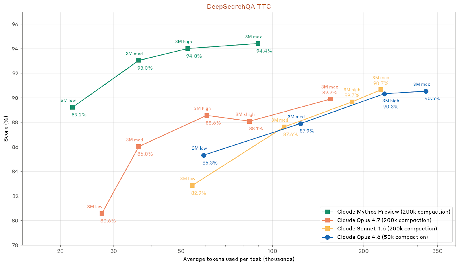 Agentic 搜索的细分基准里,Opus 4.7 呈现的是“整体强,但并非处处单调进步”的状态。BrowseComp 得分 79.3%,反而低于 Opus 4.6 的 83.7%;Anthropic 解释说,Opus 4.6 在这个基准上的 test-time compute scaling 曲线更好,但 Opus 4.7 在别的搜索基准上通常更 token-efficient,所以具体使用场景仍值得用户自行测试。DeepSearchQA 上,Opus 4.7 的 F1 为 89.1% ± 1.8%,其中 fully correct 比例为 80.7%,fully incorrect 7.0%,correct with excessive answers 3.9%。DRACO 上,Opus 4.7 得分 77.7%,相较 Opus 4.6 的优势主要集中在“分析广度与深度”以及“引用质量”,事实准确性和表达质量则变化不大。