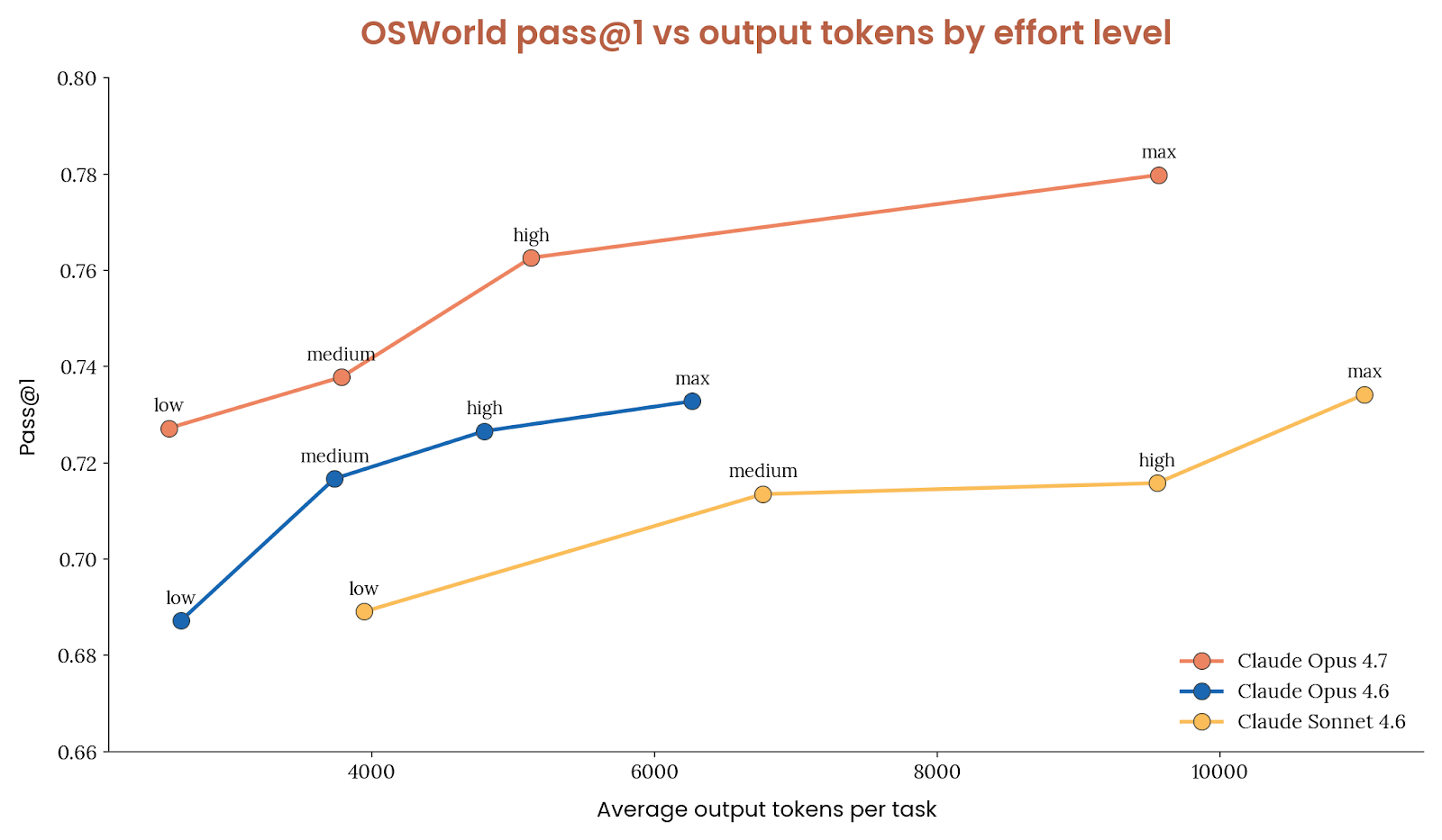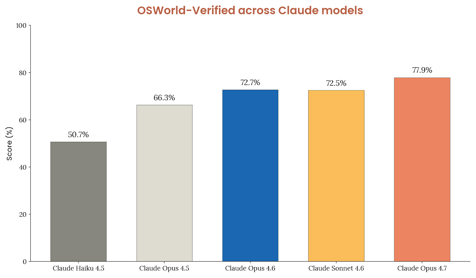 ScreenSpot-Pro 体现的是高分辨率 GUI grounding 能力。Opus 4.7 无工具时得分 79.5%,带 Python 工具时 87.6%;如果把图像下采样到旧上限,分数会掉到 69.0% / 85.9%,说明高分辨率支持对专业应用截图理解非常关键。OSWorld 这类开放式计算机任务上,Opus 4.7 的首尝试成功率为 78.0%,高于 Opus 4.6 在同一新版脚手架下复跑得到的 72.6%。Anthropic 特别说明,新脚手架包含一些稳定性修复和提示微调,如鼓励一次 tool call 批量执行可预测操作、及早承认任务不可行、并在每回合感知剩余步骤预算;但这些改动在旧模型上没有带来显著抬升,因此分数增益大体可归因于模型本身。