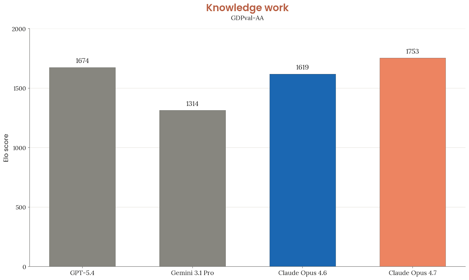 GDPval-AA 代表的是更宏观的“经济有价值真实任务”排名。Artificial Analysis 独立运行后,认为 Opus 4.7 比 GPT-5.4(xhigh)领先约 79 Elo,对应大约 61.2% 的两两对战胜率。这是 Anthropic 在系统卡里少数明确强调“领先一般公开可用模型”的一组证据之一。