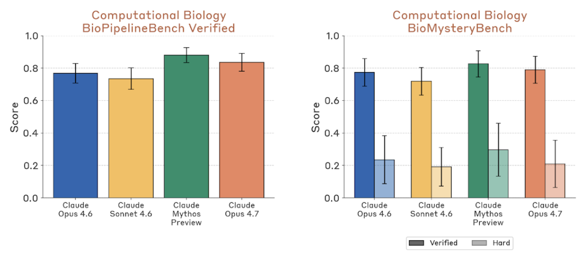 具体来说:BioPipelineBench Verified 为 83.6%,高于 Opus 4.6 的 78.8% 和 Sonnet 4.6 的 73.5%,低于 Mythos Preview 的 88.1%;BioMysteryBench Verified 为 78.9%,Hard 子集为 20.9%,后者与 Opus 4.6 的 23.5% 大致在噪声范围内,说明“人类尚未解决的困难分析题”依然很难。结构生物学上,选择题版本达到 98.3%,开放问答版本达到 74.0%,后者比 Opus 4.6 的 30.9% 翻倍有余。有机化学为 77.2%,相较 Opus 4.6 的 57.9% 是一次大跃升;系统发育学为 79.6%,显著高于 Opus 4.6 的 61.3%;实验 protocol troubleshooting 为 51.8%,也高于 Opus 4.6 的 48.3%,只是离 Mythos Preview 的 65.7% 仍有明显距离。